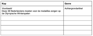 - Blader door de (online) kranten. Wat voor een soort artikelen kom je tegen over de Olympische Winterspelen? Kijk voor alle journalistieke genres (tekstsoorten) in ons Journalistiek handboek. Maak een overzicht van de gevonden artikelen en de genres: